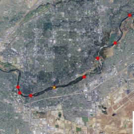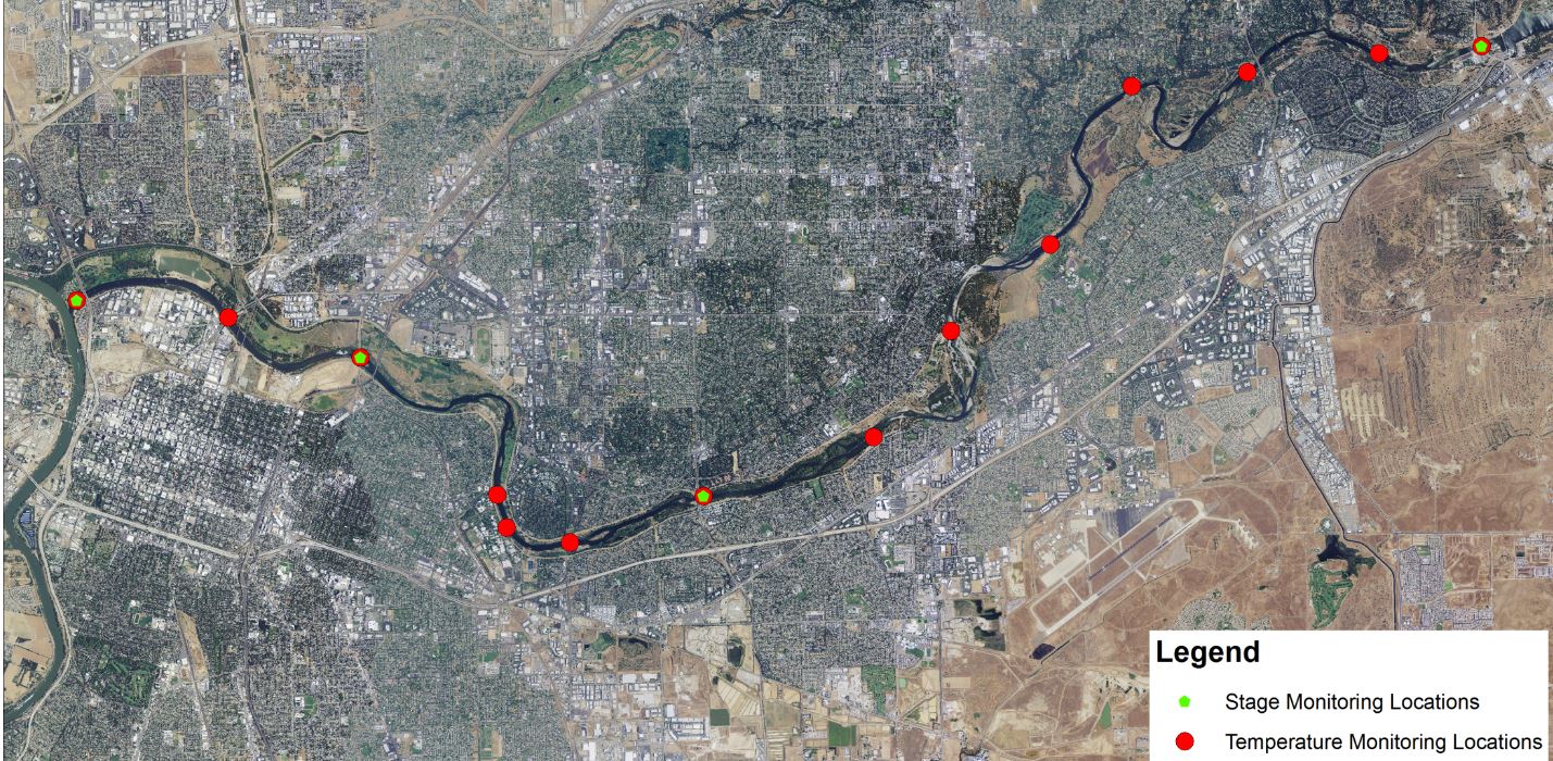Physical Monitoring – Physical monitoring including stage and water temperature gaging, and bathymetric surveys were conducted to inform model development calibration and validation. cbec has deployed and continues to maintain 14 temperature loggers and 4 stage loggers along the LAR. cbec has also undertaken bathymetric surveys for the entire 23 mile LAR and the 7 mile reach between Folsom and Nimbus Dams using a boat-mounted fathometer connected to RTK GPS.