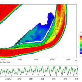 Example of initial screening alternative animation showing water depth, velocity vectors