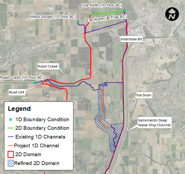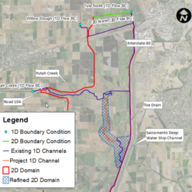 The hydrodynamic model TUFLOW, developed during the DWR/USBR Yolo Bypass Salmonid Habitat Restoration and Fish Passage Project EIS/EIR, was used to design the capacity and geometry of the realigned channel to meet fish passage criteria and meet floodplain inundation and duration objectives. Model results were also used to understand potential methylmercury and flood conveyance impacts within the YBWA.