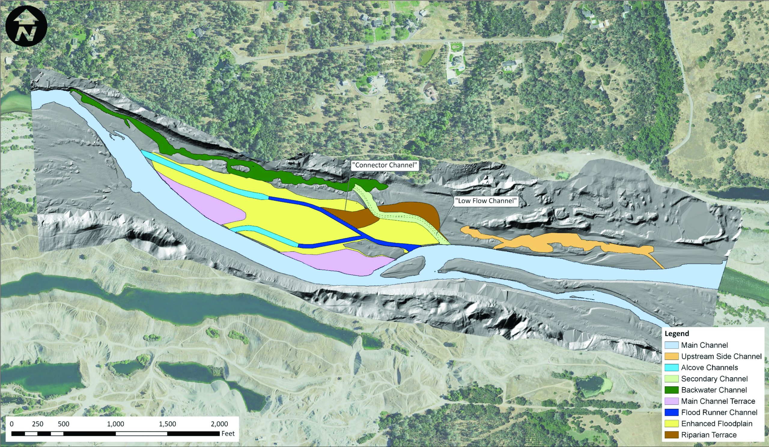 The process for creating and refining the design was iterative and involved developing a design surface, testing the design with a hydrodynamic model, evaluating results to determine the amount of usable area produced, then continuing to refine and evaluate the design to optimize the usable area. Usable area was determined according to habitat suitability indices for juvenile salmonids that indicate their preference for velocity and depth of flow. Project designs include plans to remove a portion of the legacy hydraulic mining substrate on Long Bar to create improved floodplain connectivity, and habitat heterogeneity to promote riparian vegetation recruitment and salmonid rearing habitat.