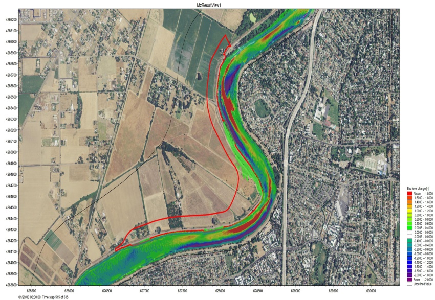 cbec provided geomorphic and hydrodynamic modeling services, as well as ecological habitat design for aquatic and terrestrial species. Our primary role was to analyze hydraulic and geomorphic conditions at the site, assess the potential for levee and channel erosion and deposition, and estimate sedimentation impacts for the preferred design alternative, which included levee setback and floodplain lowering. To accomplish this, cbec collected sediment transport data (bed and suspended load) as well as ADCP (Acoustic Doppler Current Profiler) discharge measurements on the Sacramento River over a range of flow conditions. These data were used in the development and calibration of a 2-dimensional hydrodynamic sediment transport model (DHI – MIKE 21C) that was employed to assess various feasibility and design aspects of the levee setback project. Specifically, the model was used to characterize the existing sediment regime and long-term geomorphic function (erosion and deposition trends) as well as site specific erosion control design. Using the model and the geomorphic assessments, cbec established how the site evolved historically, which informed the design of the setback levee relative to the sediment transport regime.