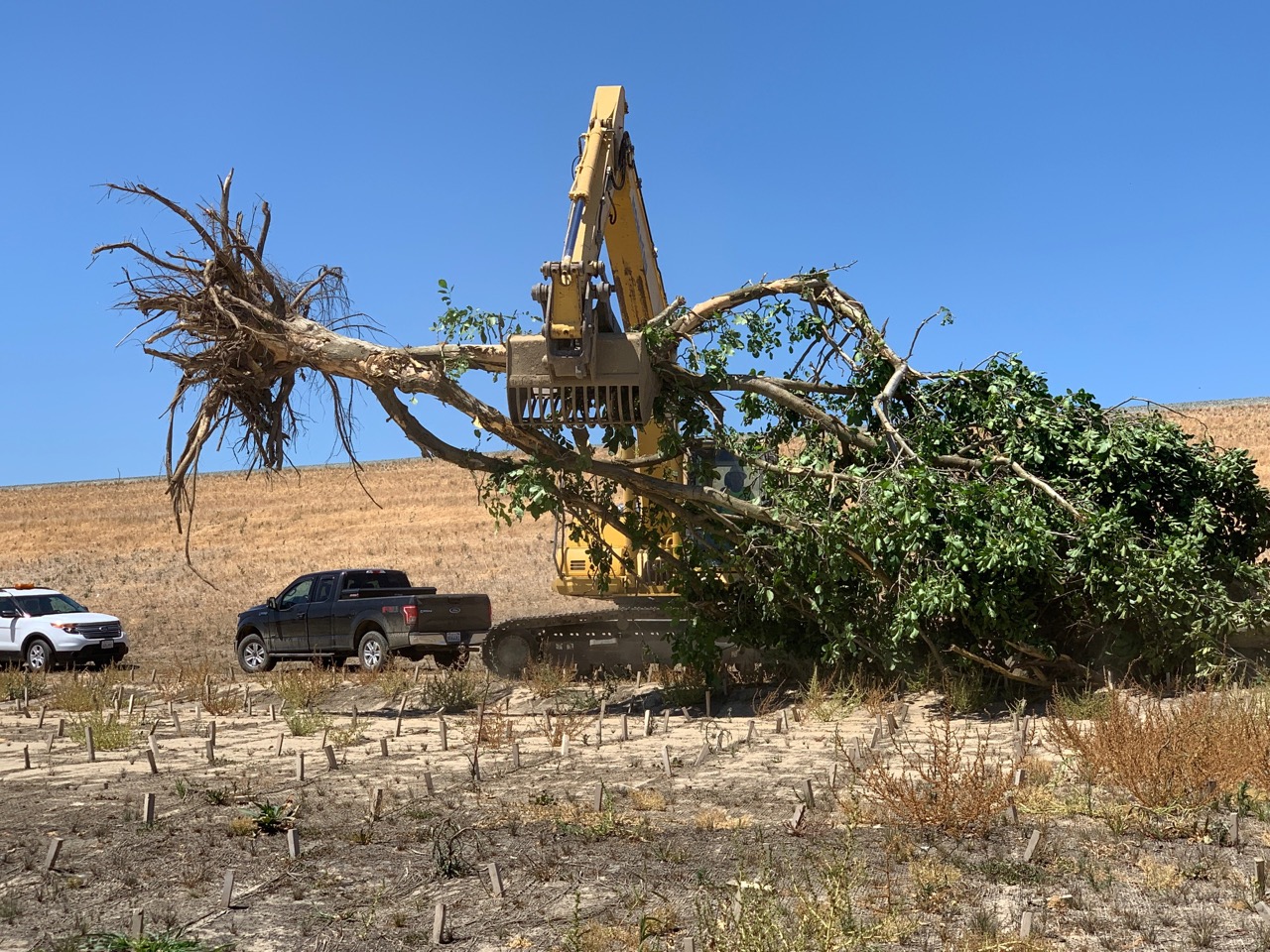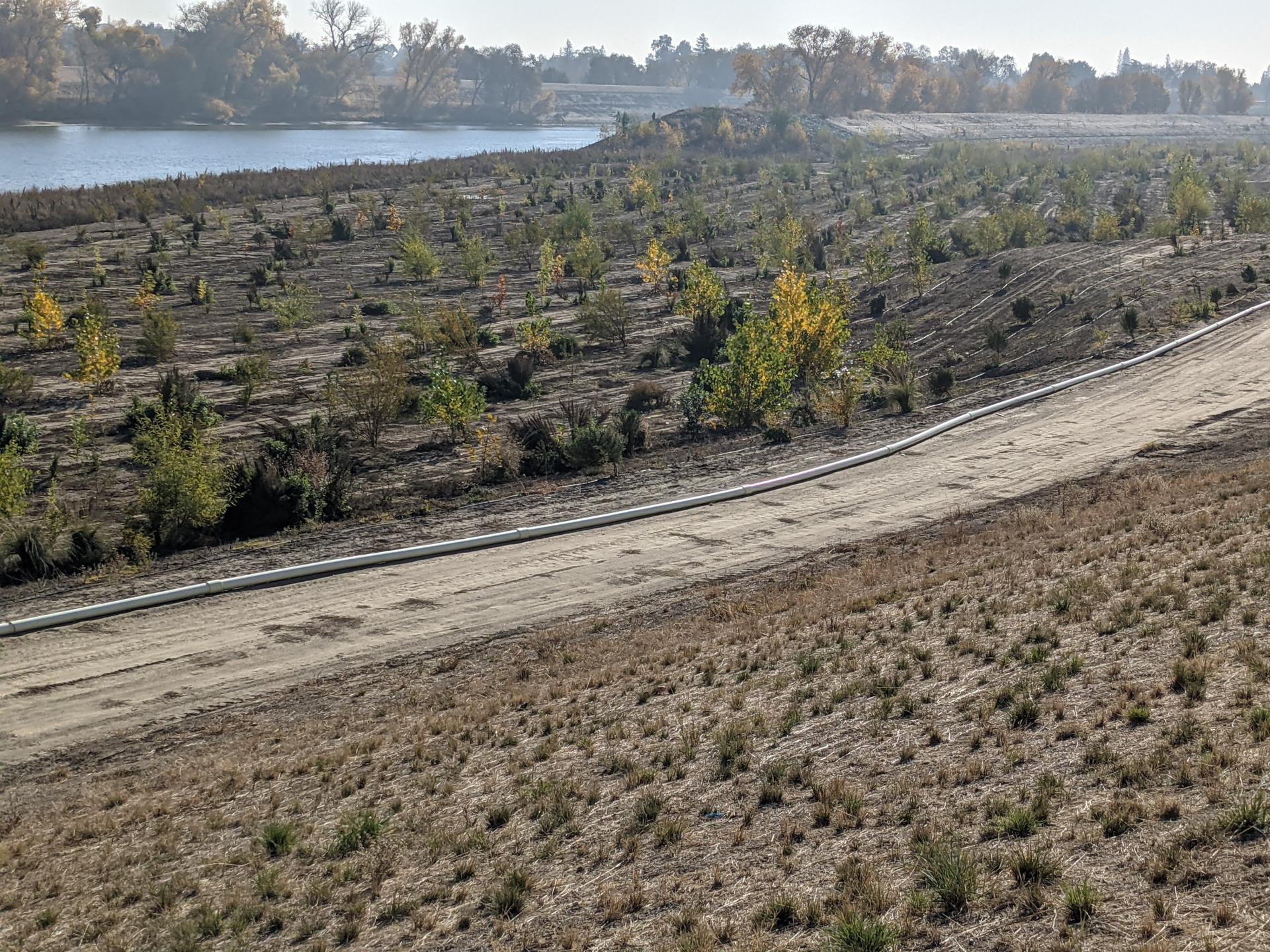 While the construction photos show a very harsh, barren environment currently, the artistic rendering demonstrates that, once completed, a dense riparian forest will rapidly establish.
